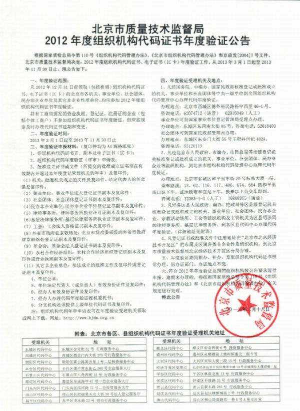 关于“北京市质量技术监督局2012年度三千万彩票概况代码证书年度验证公告”