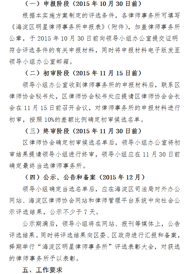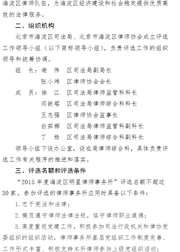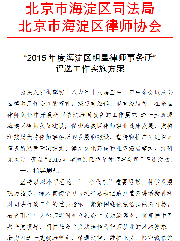 为进一步加强海淀区律师队伍建设,促进海淀区律师事业健康发展,支持和鼓励优秀律师事务所的发展和建设。经研究同意,现将《2015年度海淀区明星律师事务所评选工作实施方案》印发给你们,请认真执行落实,积极参加评选。